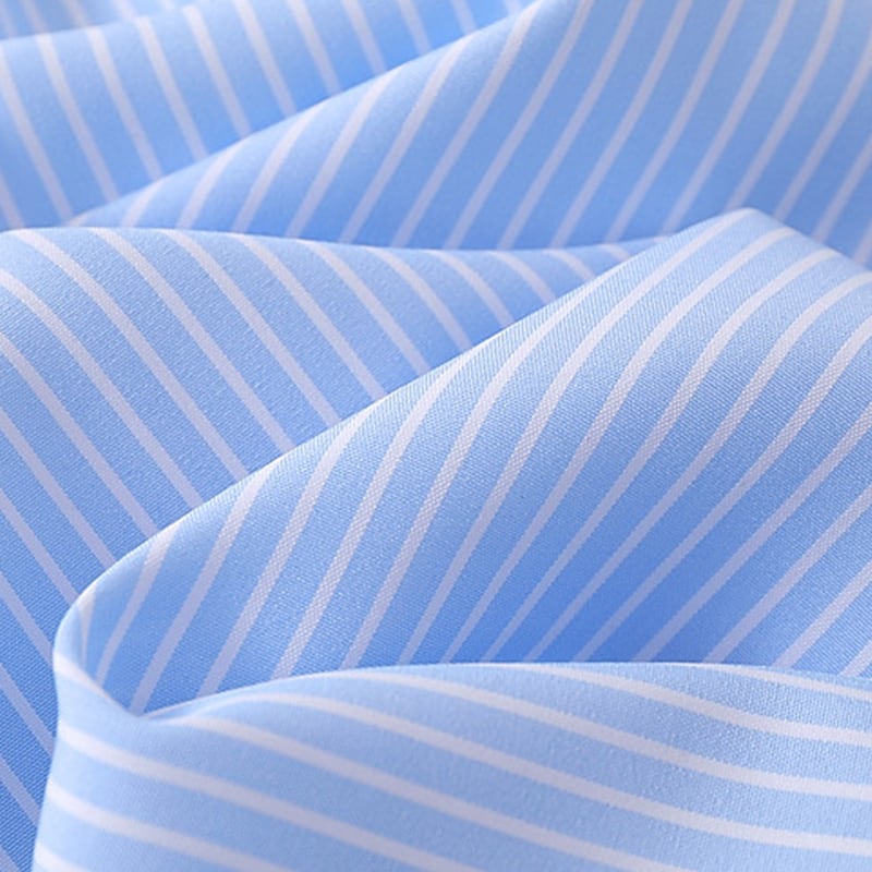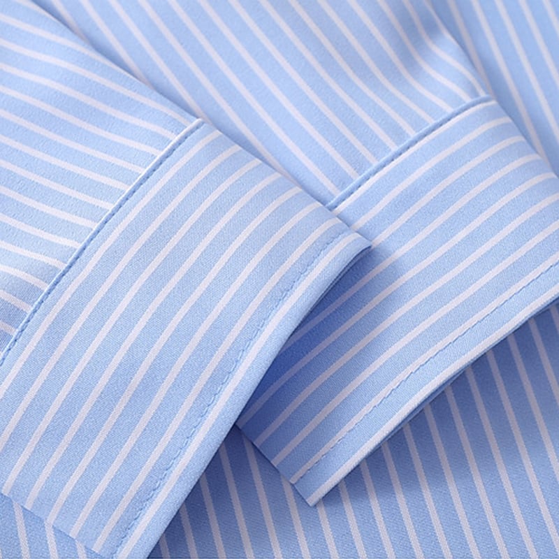 細かな縦ストライプ柄がクリーンで洗練された印象を与える長袖シャツ。